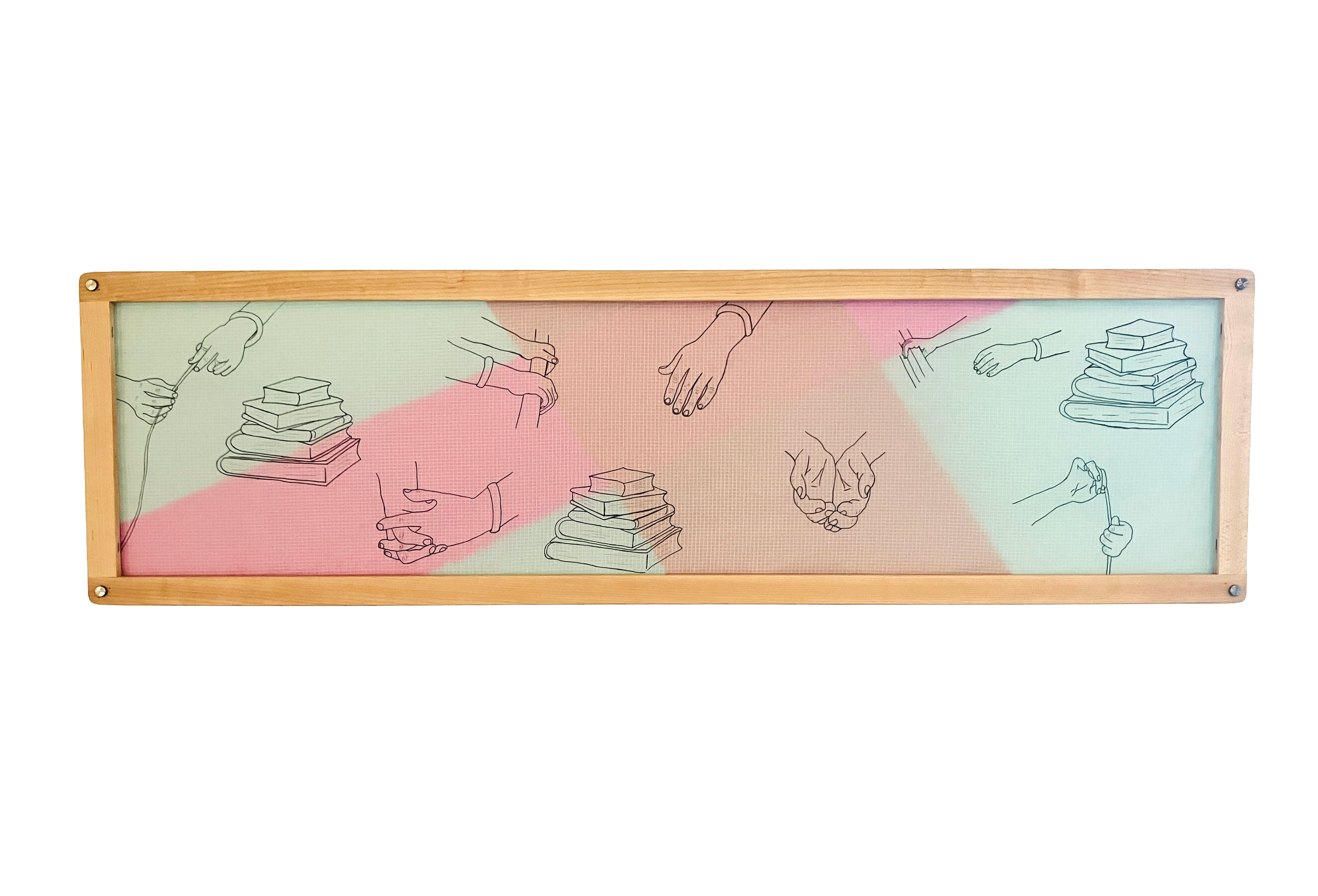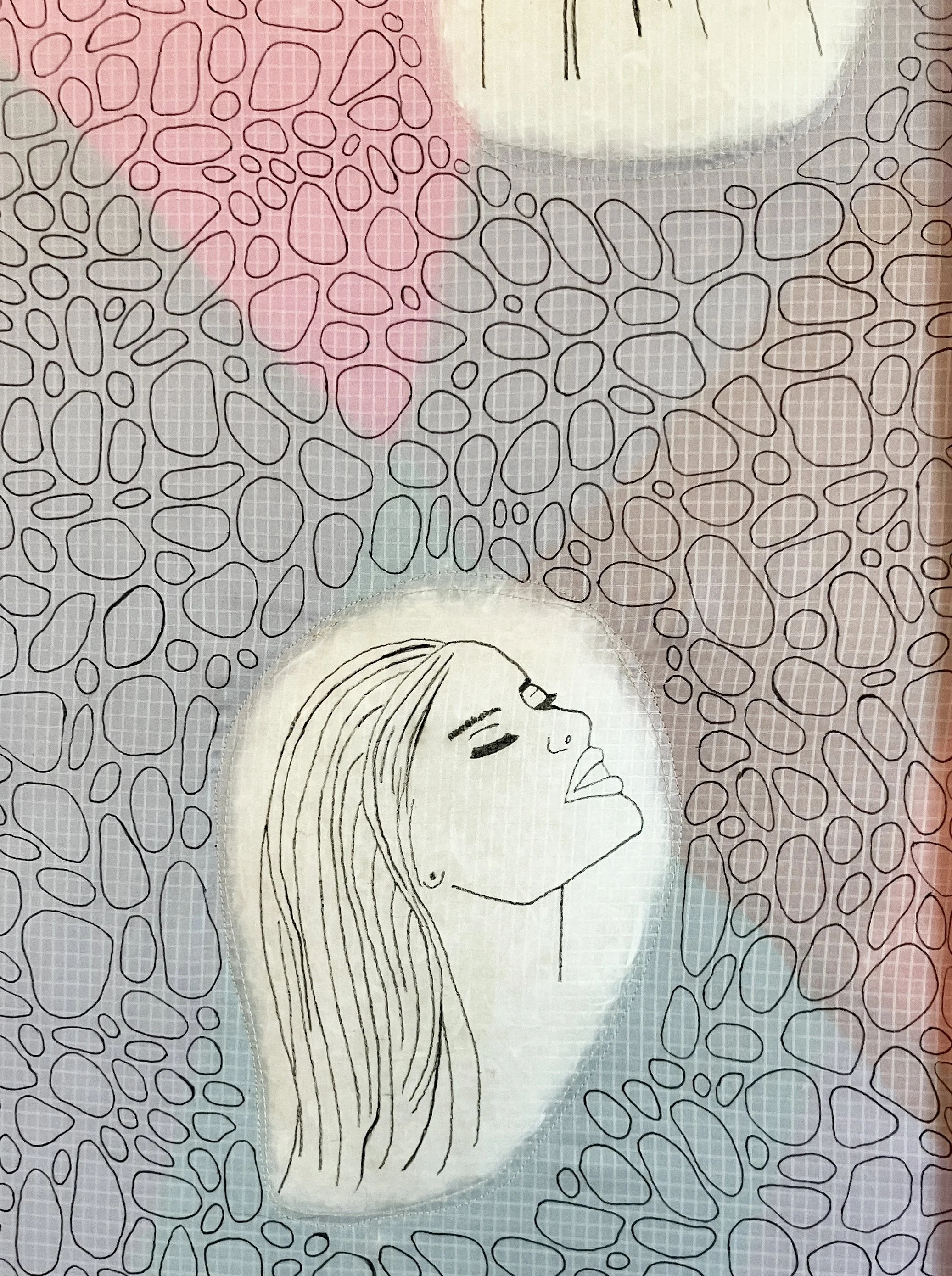 Using repurposed tent materials, down filling as well as defective loom harnesses as frames, I drew and stitched to create this pairing about purpose and private life.