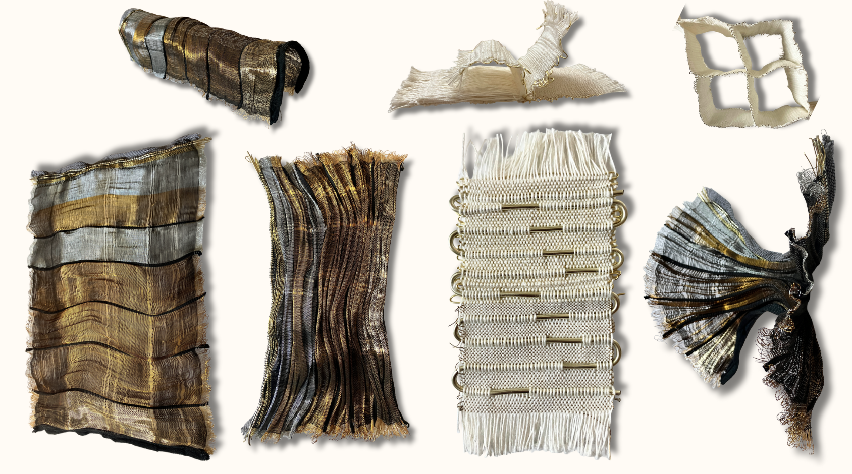 I experimented with a range of weights and types of metal and combined with a different fibers in the weft. I also worked with multi-layer weave structures and adding other materials such as elastic in between metal wefts to create effects in the resulting fabrics.